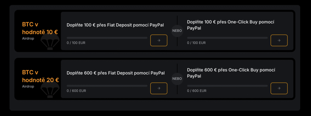 Hlavním tahákem integrace je časově omezená promo akce, která všem klientům nabízí možnost získat atraktivní odměnu až 30 eur v bitcoinech. Pokud si jako nový uživatel založíte účet a přes PayPal vložíte alespoň sto eur, získáte okamžitý bonus v hodnotě deset eur.